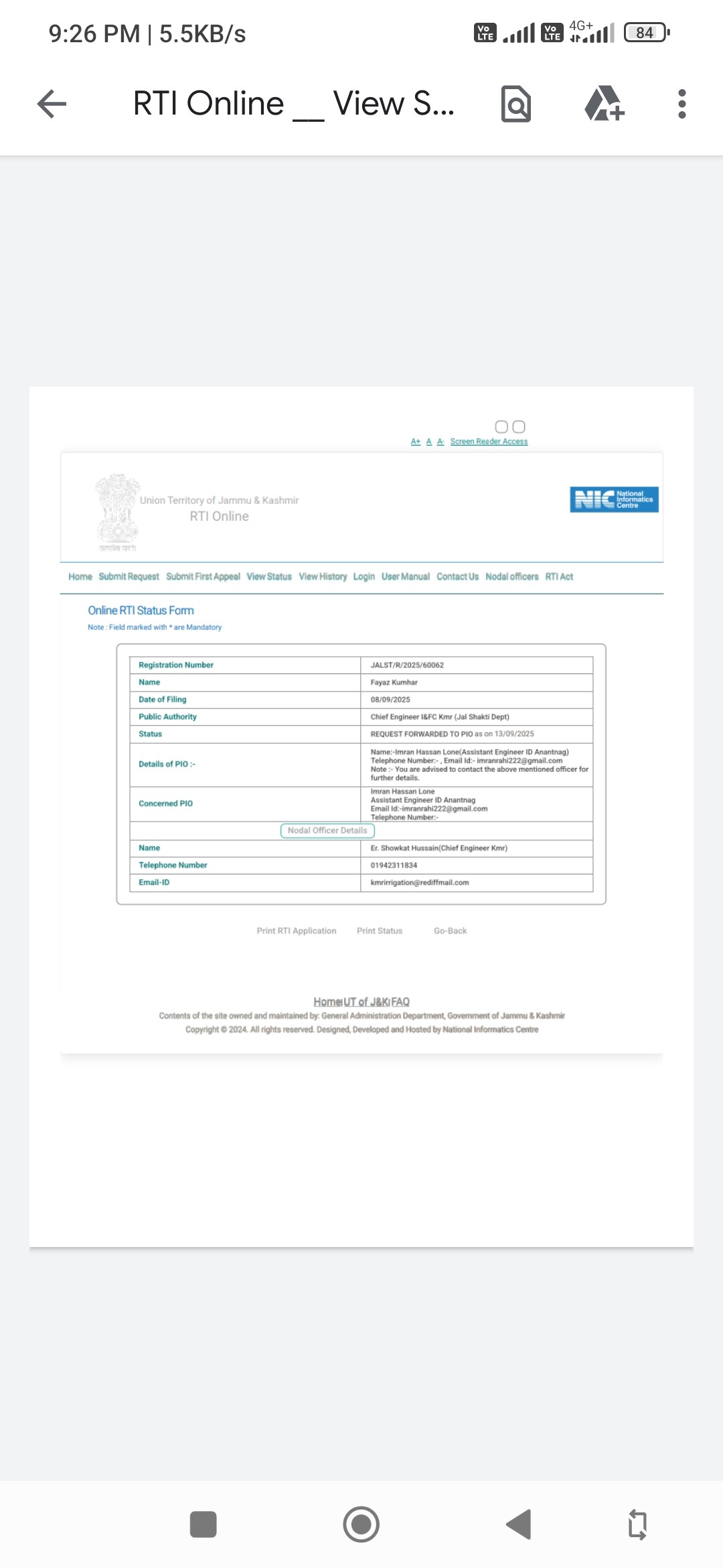 Status shows the RTI is forwarded to the PIO; wait up to 30 days for a reply under RTI timelines. Check View Status on the J&K RTI portal and pay any additional fee if intimated there. To notify the concerned PIO, you can contact on the given communication numbers and emails.