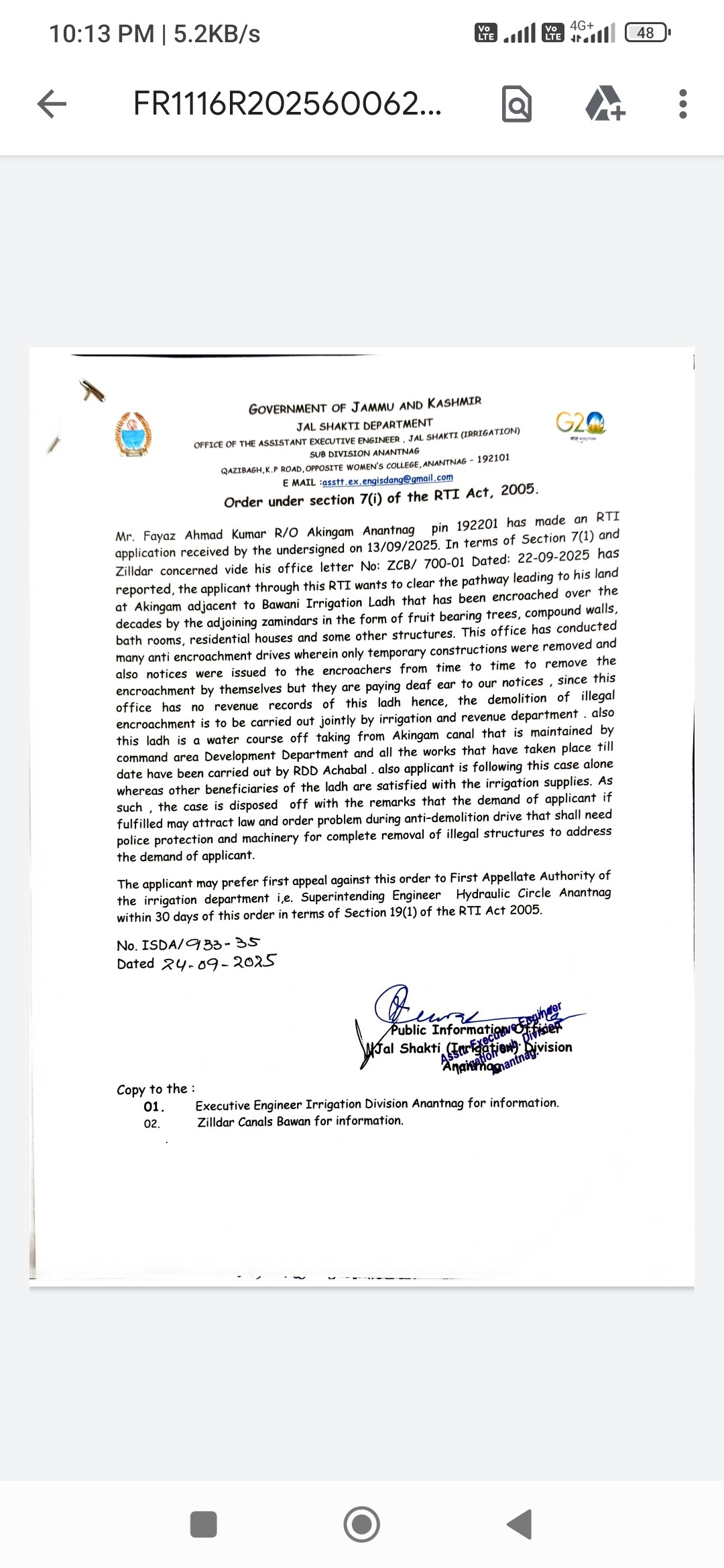 The PIO of Jal Shakti (Irrigation) Division, Anantnag, has issued an order dated 24-09-2025 under Section 7(1) disposing of the RTI request, so the application is treated as replied/closed at the department with the statutory remedy of a First Appeal within 30 days to the Superintending Engineer, Hydraulics Circle, Anantnag. The order narrates encroachment inspections and temporary demolition, references RDD Achabal, and then disposes the case while stating the applicant may file a First Appeal, indicating contradictions that can be challenged at the appellate stage.