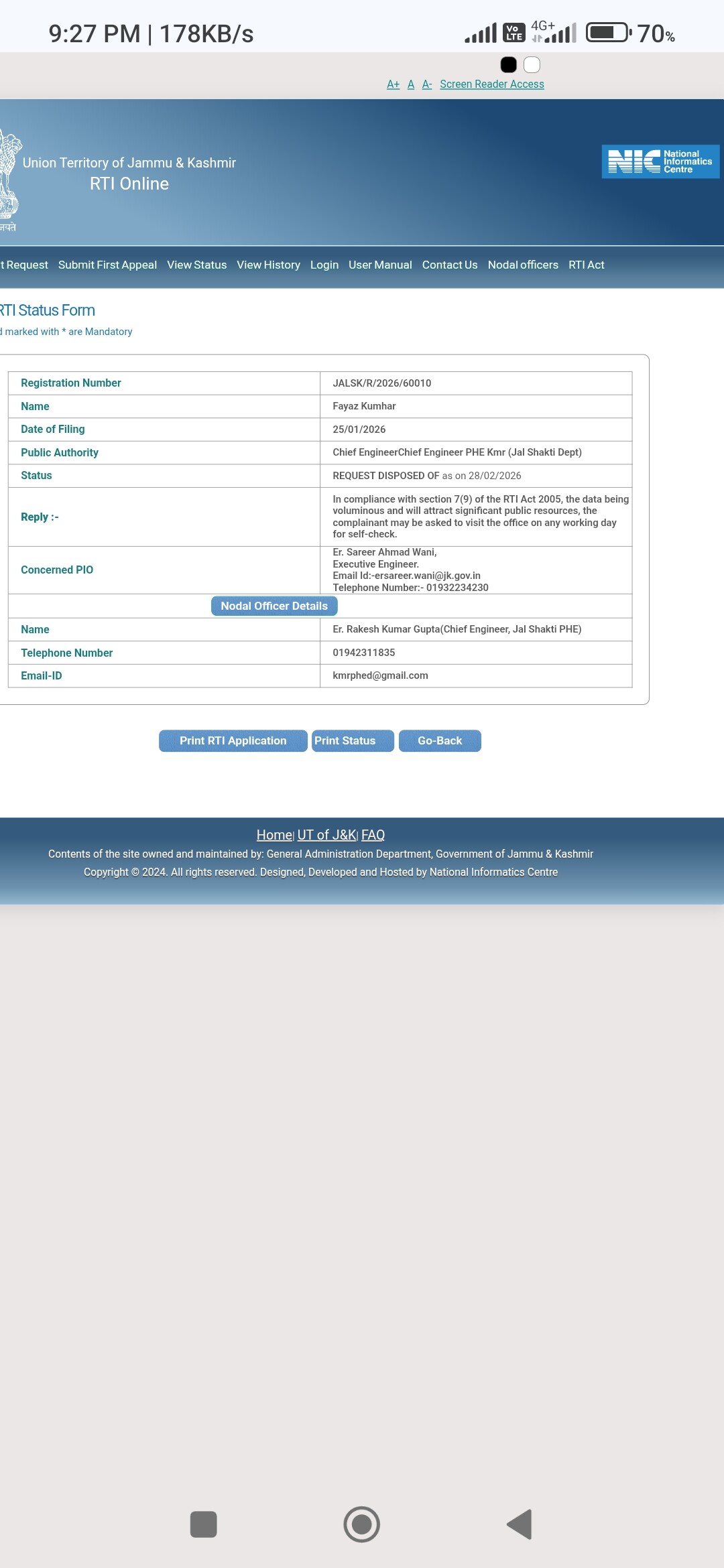 - As I have replied earlier, you may file a First Appeal immediately (within 30 days) to the First Appellate Authority (senior officer at PHE Kokernag/Anantnag Division) via RTI portal or post, demanding full disclosure and action details.
