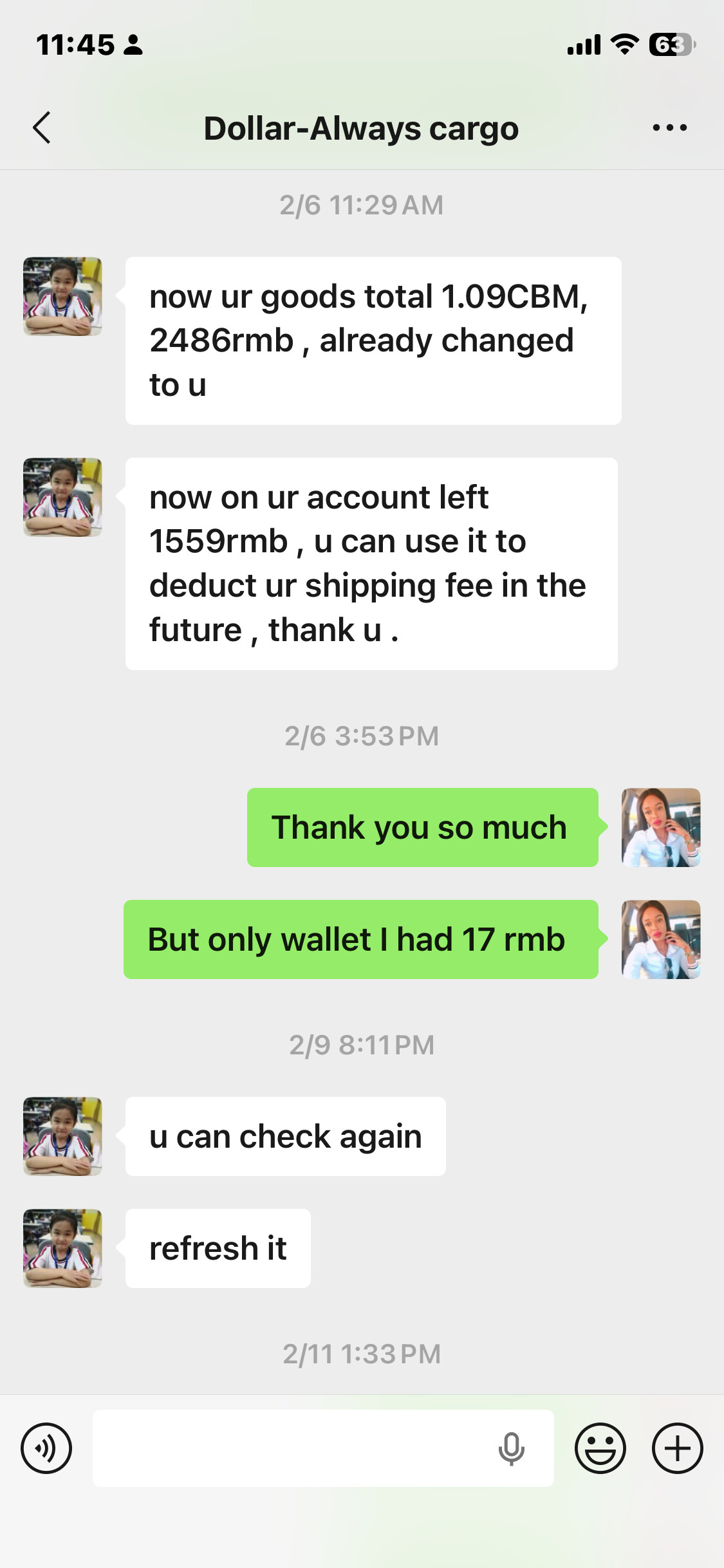 Looking at the screenshots you just uploaded, you have a rock-solid case. Even if the initial math of the payments was confusing, it doesn’t matter anymore because you have the ultimate proof: their agents (“Dollar-Always cargo” and “Ouny-Allwayse Cargo”) explicitly admitted in writing that you have a 1559 RMB balance and flat-out refused to refund it. Forcing a customer to accept “store credit” for a company’s own billing mistake is completely illegal under Chinese consumer and commercial law, especially since you are relocating to Germany and cannot even use their service.